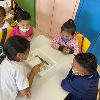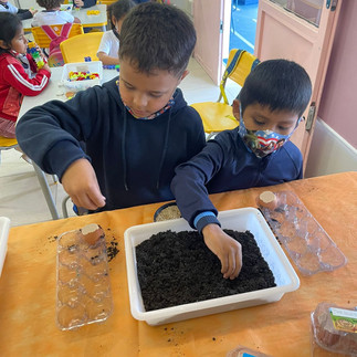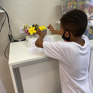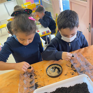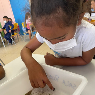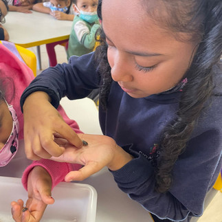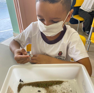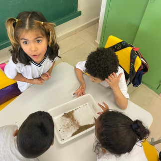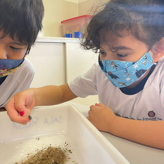 Aqui na nossa escola trabalhamos com experiências científicas de várias formas, expondo as crianças a todas as áreas da ciência por meio de materiais, experiências práticas e também examinando elementos da natureza como árvores, plantas, folhas, flores, gravetos e até os insetos.
